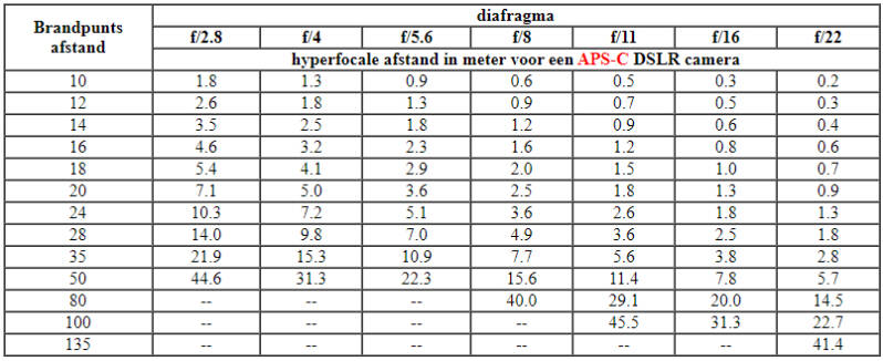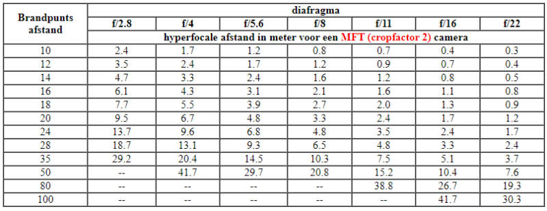Hyperfocale afstanden van 50 meter en meer heb ik niet opgenomen in de tabel.