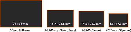 De full-frame camera heeft duidelijk een grotere beeldhoek ten opzichte van de kleinere sensoren.