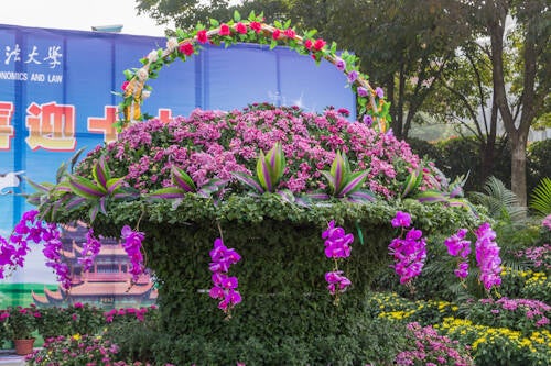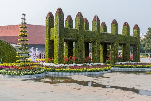 Bij ons vorige bezoek was men aan het werk op het plein voor het museum. Er werden verschillende taferelen met bloemen en figuren opgezet. Daarom zijn we vandaag nog even terug gegaan.