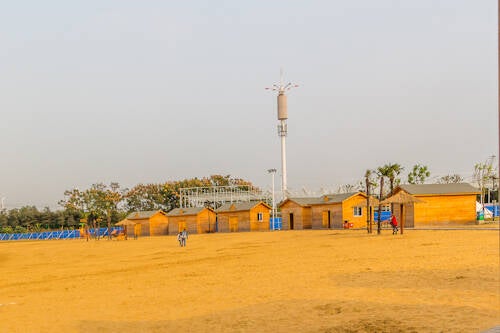Zoals gezegd, ligt het strand er nog verlaten bij. Ook hier nog drukke werkzaamheden. Er is een meertje en zand is aangevoerd. Verder staan er een aantal, wat waarschijnlijk vakantiehuisjes worden, maar die zijn nog leeg. Een vijftiental tenten zijn wel al ingericht met elk 2 bedden.