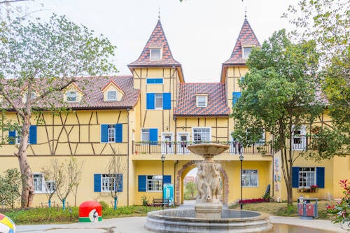 Zoals het in China normaal blijkt te zijn, is ook dit project groots opgezet en uitgestrekt. Alles heeft Franse namen; het stadje is Ville Fleurie en het strand krijgt de naam Cannes Plage. Ik veronderstel dat men er een franse sfeer wil creëren. Ook staan er twee windmolens in een gebied met water en bruggetjes dat meer Nederlands aandoet. En bij het postkantoor staat een postbus met het opschrift ´China Post´.
