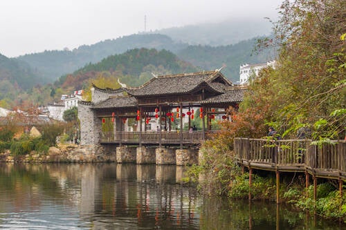 Bergen dus, waarin mooi aangelegde paden en trappen, beekjes en watervalletjes, veel natuur en nu nog hier en daar een veld met bloemen. Ook waren er de klassieke Chinese bouwwerken en versieringen.