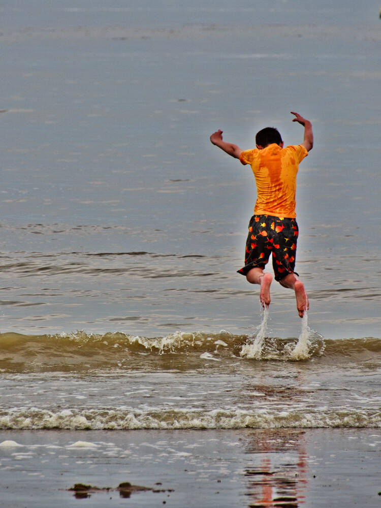 Op deze foto leg ik de beweging, de sprong van de jongen en het water stromend van zijn voeten, vast. Dit door bevriezing van het beeld, waarbij ik gebruik maak van een (relatief) korte sluitertijd.