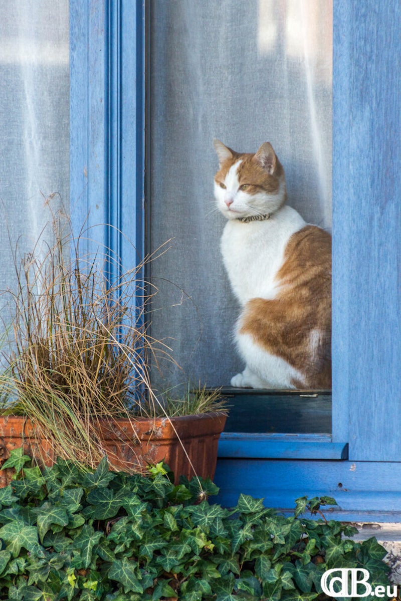Mijn aandacht werd getrokken door de zachte, maar wat melancholische blik van een kat achter het raam. Het was een beeld dat me diep raakte – een unieke mix van charme en weemoed. Het verweerde houten raamwerk, in een nostalgisch blauw geschilderd, droeg duidelijke sporen van vergane tijd. De licht verwaarloosde plantenbak en de gevelbegroeiing versterkten het authentieke, bijna tijdloze karakter van de scène. De blik van de kat leek iets te vertellen – misschien een stille hunkering naar vrijheid, een verlangen naar de buitenwereld, of simpelweg naar gezelschap. Het was een moment van pure eenvoud, een klein, onuitgesproken verhaal dat je hart even stil liet staan.