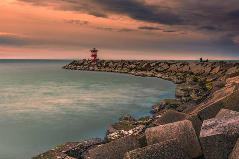 Tegen zonsondergang, die achter de wolken bleef, maar wel mooie kleuren gaf. De kromming van de golfbrekers volgen en je komt via de het einde bij de mooie luchtkleur terecht.